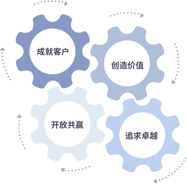 成就客户是一切决策的出发点,,,,创造价值是衡量所有工作的标准,,,,追求卓越是我们做事做人的态度,,,,开放共赢是我们的格局也是最终的结果。。。。价值观的齿轮环环相扣,,推动着组织里的每个人不断向前。。
